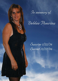 The cancer had spread to her bones and internal organs. She received 4 weeks of radiation, and her first dose of chemotherapy 2 days before Christmas. Debbie passed away on December 27, 1996. The doctors speculated Debbie had breast cancer for 2 to 3 years.