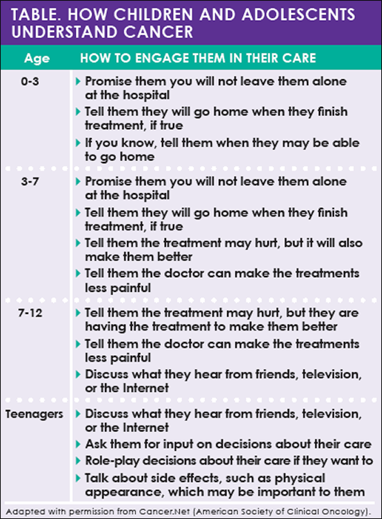 Although children and adolescents may not be able to fully understand their disease or make informed decisions about their cancer care, you can empower your child to understand the disease in an age-appropriate way. When things happen around a child without an explanation, it can be extremely confusing.