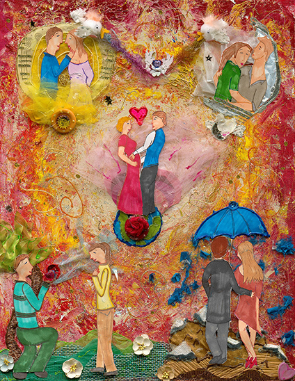 I tend to work with many layering and mixed media materials—anything from tissue paper to fabric, buttons, papers, or toilet paper—whatever I found in hospitals as I recovered. I paint whatever I feel in my heart.