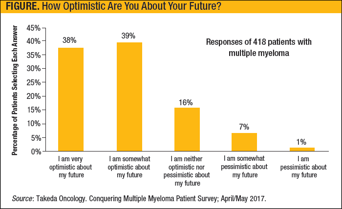 An online survey conducted by Takeda Oncology and The Lynx Group in April/May 2017 showed that among more than 400 people with multiple myeloma, most (77%) are optimistic about their future, as can be seen in the Figure. People living with multiple myeloma who proactively seek information are more likely to feel optimistic about their future than those who do not seek information. In this survey, being optimistic about the future was also associated with: