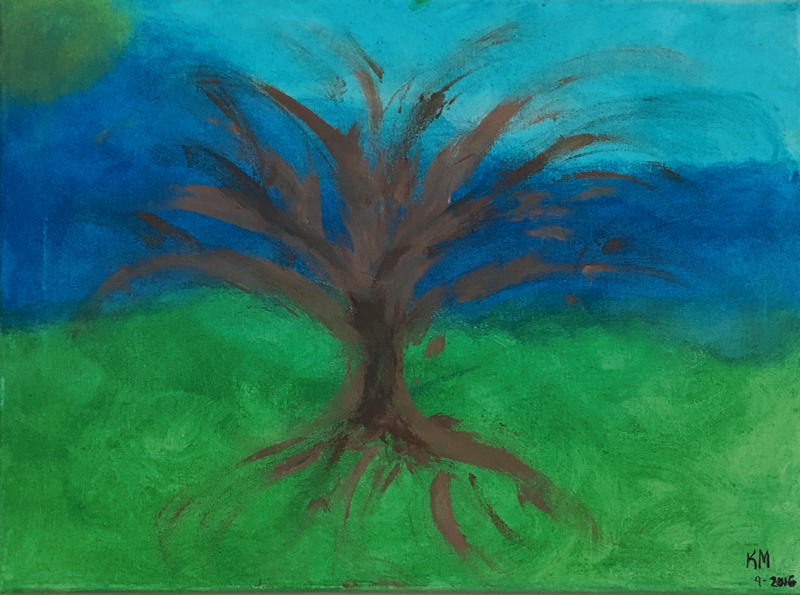 I made this painting using acrylic paints. I did not use paintbrushes, only my hands. I have always loved trees. I think that the different shades of browns in the painting show the sadness, loneliness, fear, and anger I was feeling after my diagnosis of breast cancer.