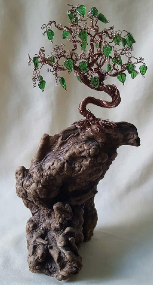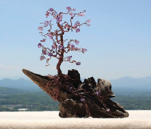 I begin with a single 45-foot spool of copper-coated wire, turning every branch by hand. I then add a complementary array of beads and fix it to a base using additional wire. The base of my trees are driftwood, amethyst, crystals or unique stones. I also make tree of life dream catchers, and tree of life wire bonsai wall art. I hope this provides an inspiration to others who are enduring the journey of cancer and its treatments.