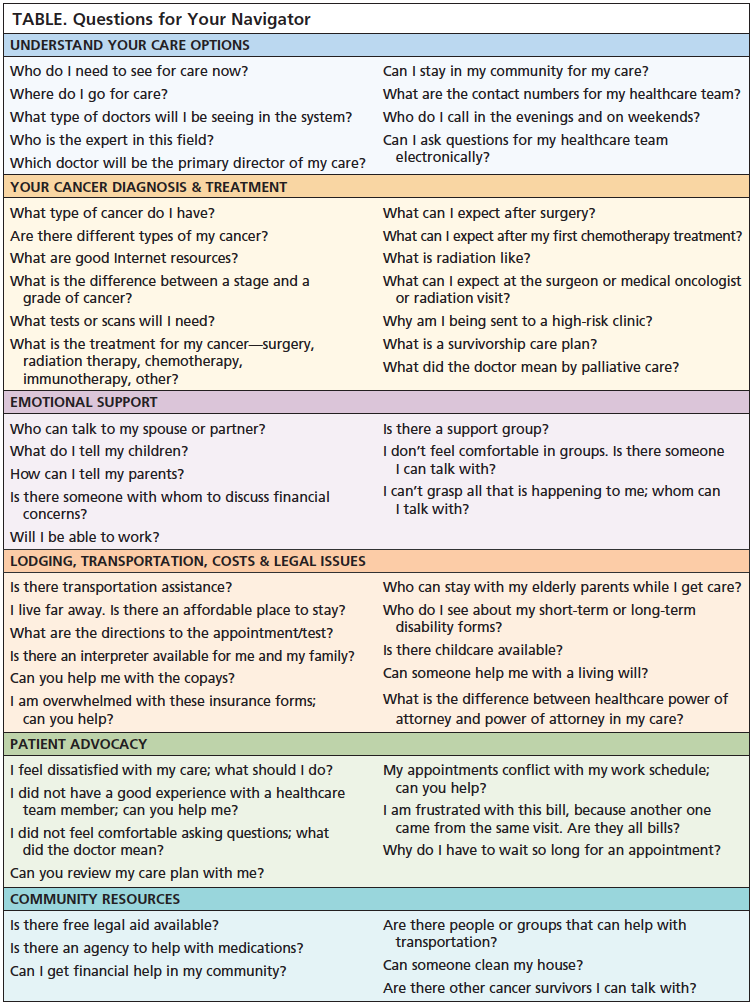 The Table lists the type of questions or concerns you may want to share with your navigator, who will help you to understand the care you are getting, or may need to get later on, as well as any other concerns you may have.