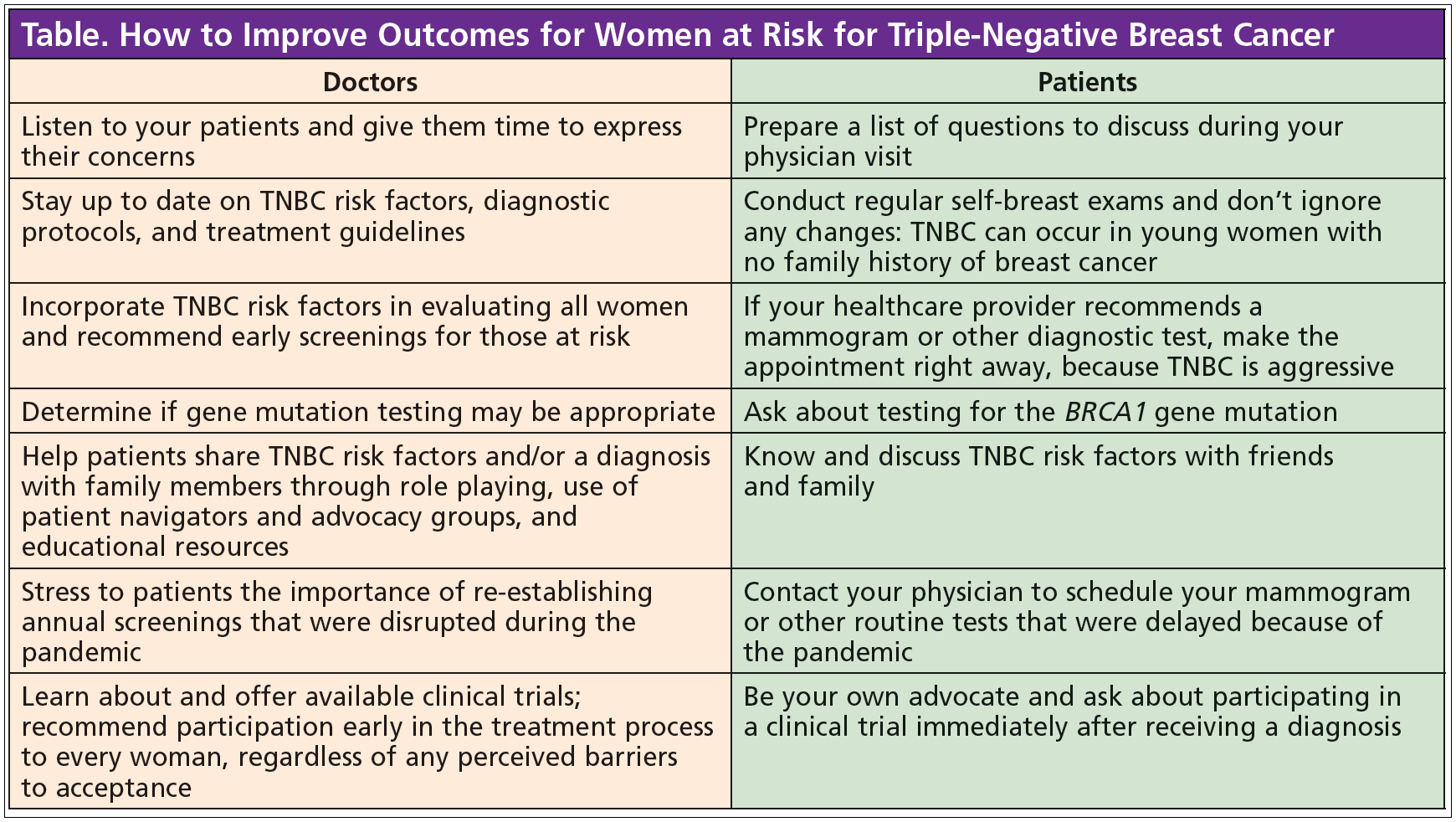 Physicians must listen to the concerns of their patients and provide individualized care by referring women, regardless of their age or family history of breast cancer, for appropriate screening and/or diagnostic tests to rule out TNBC. The Table (see below) lists actions that healthcare providers and patients can take to improve outcomes for women at risk for TNBC.