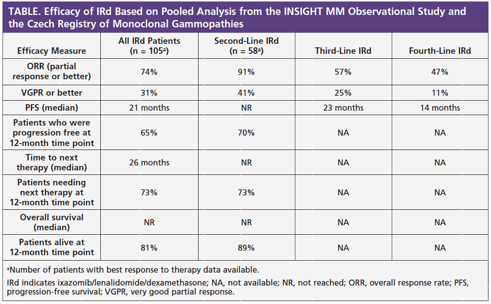 - Hajek R, Terpos E, Lee HC, et al. Ixazomib plus lenalidomide-dexamethasone (IRd) in relapsed/refractory multiple myeloma (MM) patients (pts)—effectiveness in routine clinical practice is similar to the efficacy in the phase 3 Tourmaline-MM1 trial: a pooled analysis from the Insight MM observational study and the Czech Registry of Monoclonal Gammopathies (RMG). Presented at the 2018 ASH Annual Meeting; December 1, 2018; San Diego, CA. Abstract 1971.
