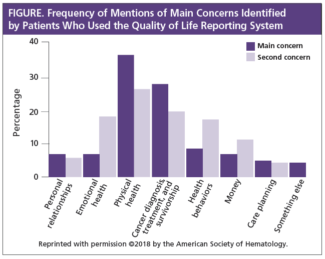 The most common concerns that these patients chose in the QoL reporting system were “physical health” (37%) and “cancer diagnosis” (27%; see Figure). This pattern remained, even when patients were given the option to pick a second major concern. No other concern was listed by more than 8% of patients. Using this system, patients also indicated a strong desire for more information about their therapy, clinical trials, their likely outcome (prognosis), and drug-related side effects.