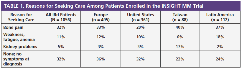At ASH 2018, researchers also presented data that profiled patients with multiple myeloma in terms of the most common reasons for seeking care and the treatments received. Table 1 summarizes the most common reasons for patients seeking care. At diagnosis, 27% of all patients had physician-reported International Staging System (ISS) stage I multiple myeloma, 26% had physician-reported ISS stage II disease, and 31% of patients had physician-reported ISS stage III disease.