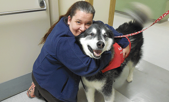 With a clean bill of health, Bandit recently returned to making hospital visits. Bri, now 16, has grown up with Bandit, who just turned 10. Even as an older dog, Bandit gets around well and is enjoying getting back into his normal routine of therapy work. After 8 years of therapy work, they have no plans to discontinue their visits to the hospital. “He still really loves people and his job,” says Kelli.
